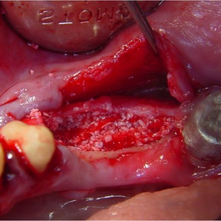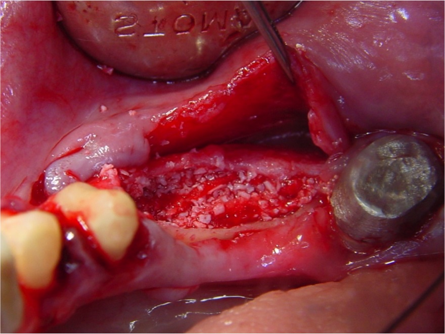 Lambou cu eliberare periostala urmat de inserare de implant dentar cu augmentare osoasa si sutura
